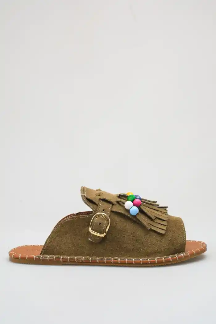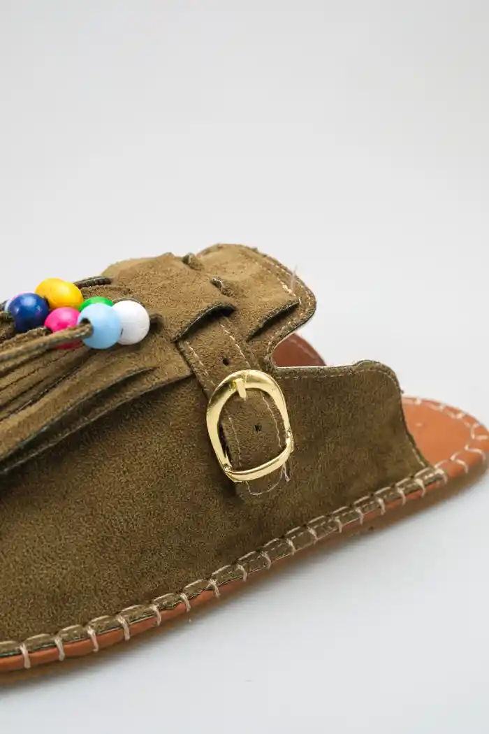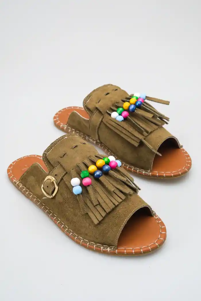 Haki Süet Kadın Boncuklu Püsküllü Terlik