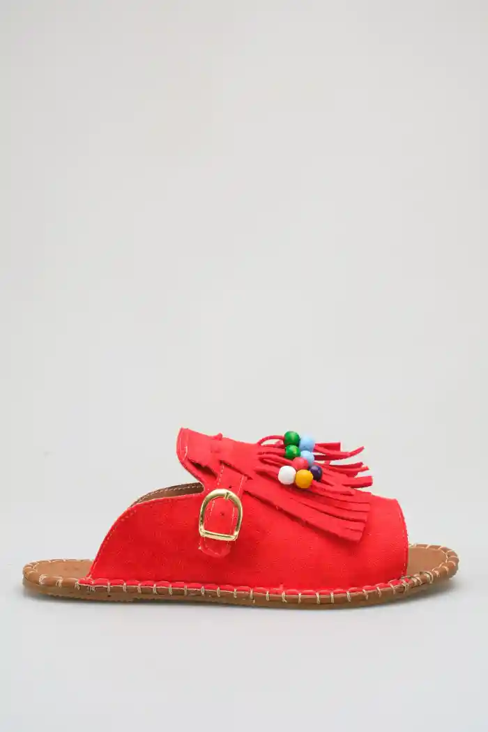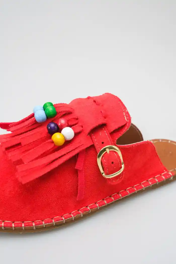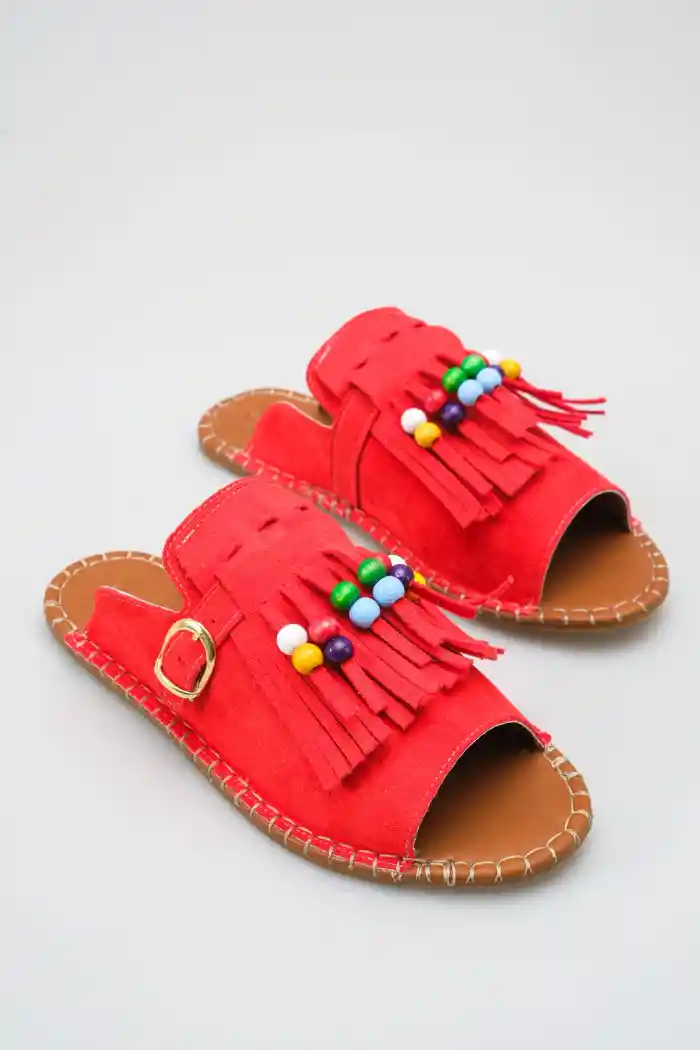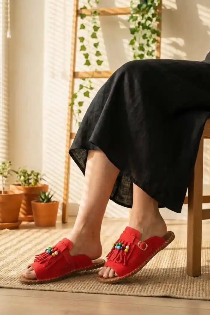 Kırmızı Süet Kadın Boncuklu Püsküllü Terlik