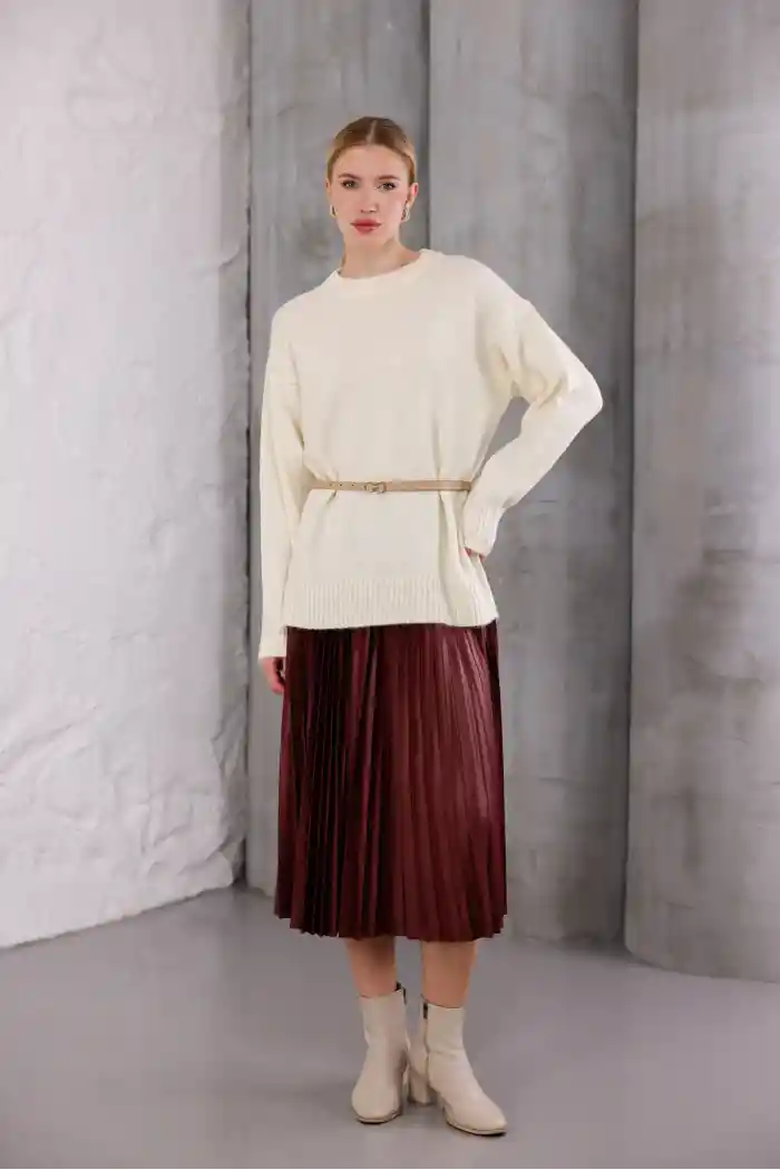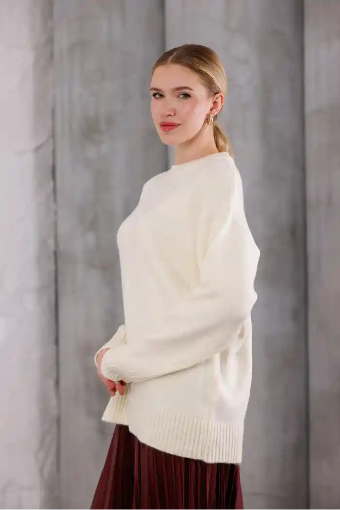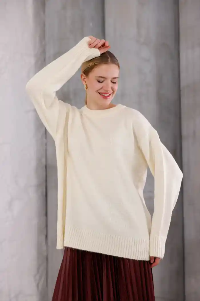 Krem Bisiklet Yaka Oversize Triko Kazak