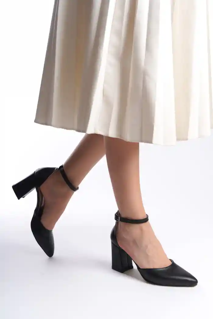 Women's Leather Heeled Pumps with Stone Buckle Detail and Thick High Heels
