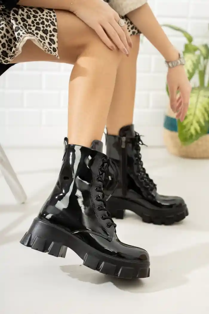 Black Leather Women's Thick Sole Lace-Up and Zipper Boot