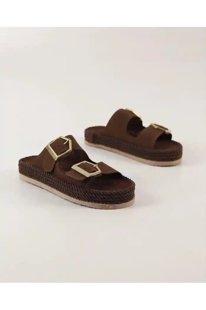 Kahve Süet Kadın Çift Tokalı Hasır Taban Yazlık Terlik