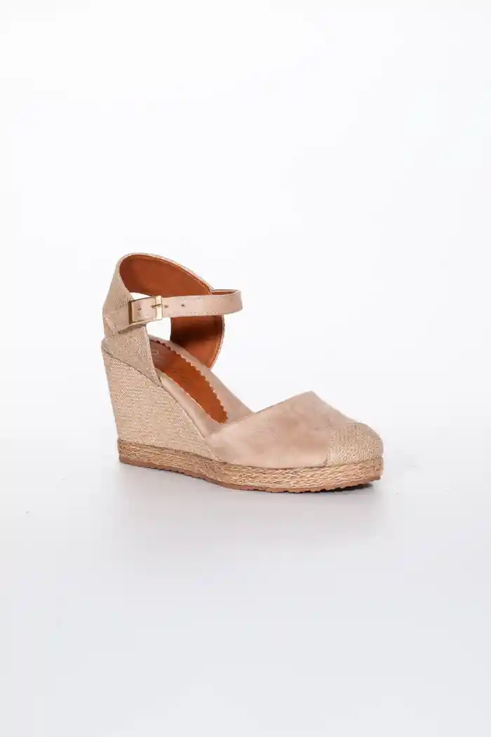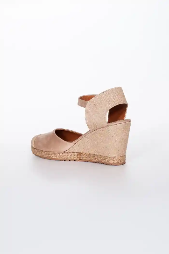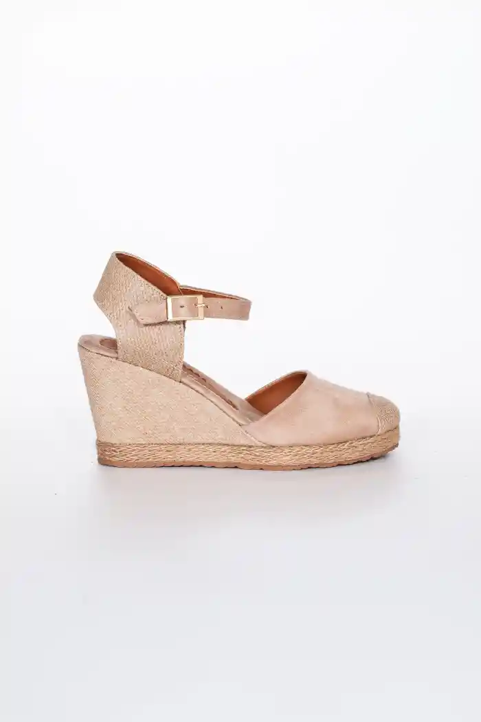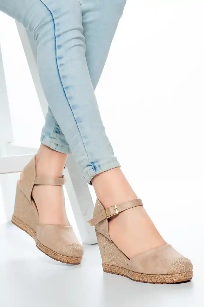 Bej Kadın Hasır Kumaş Kalın Topuklu Klasik Ayakkabı