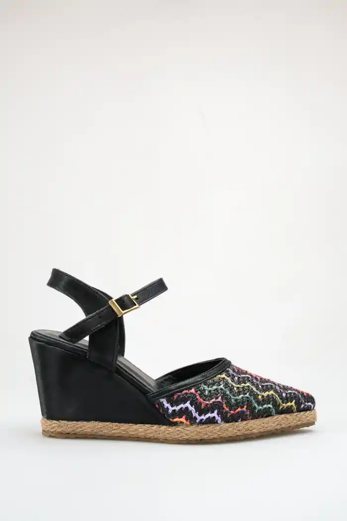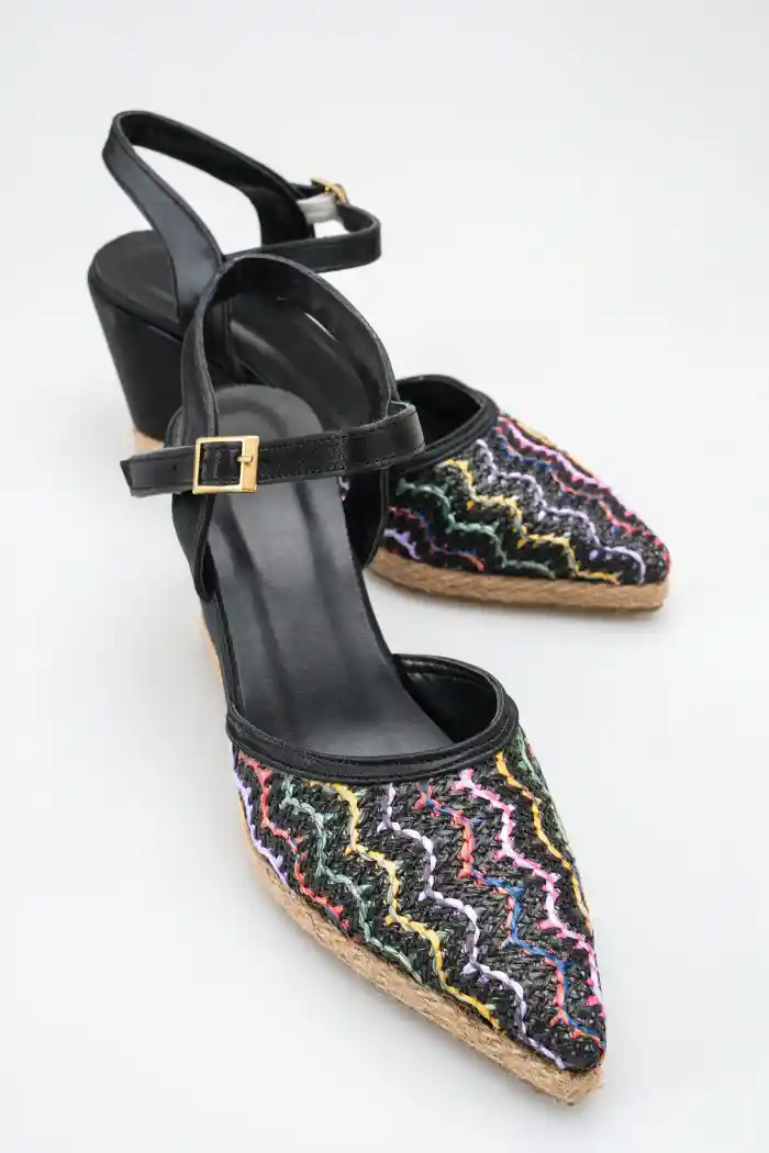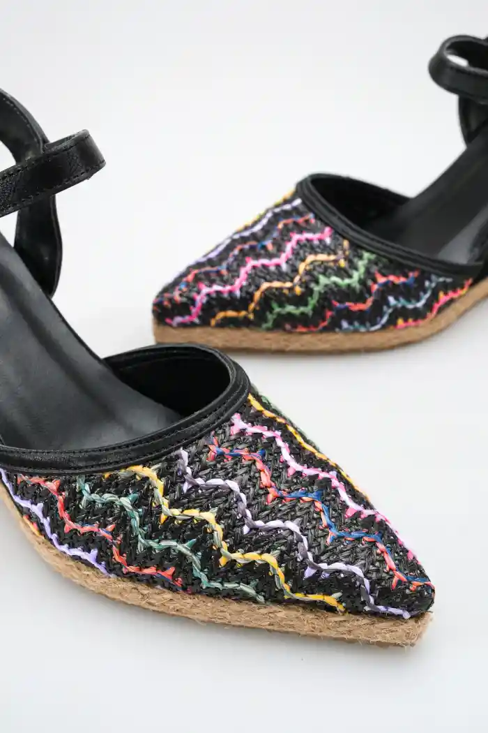 Hasır Örgü Gökkuşağı Siyah Cilt Kadın Sivri Burun Dolgu Topuklu Sandalet