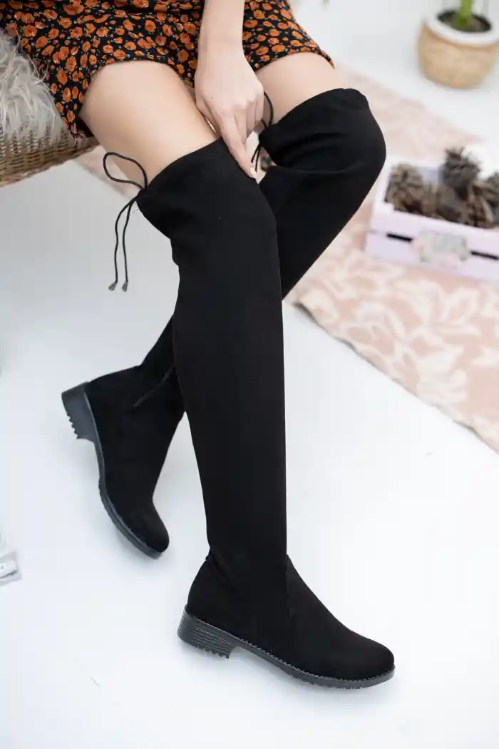 Siyah Kadın Yandan Fermuarlı Kalın Topuklu Rahat Günlük Uzun Streç Çizme