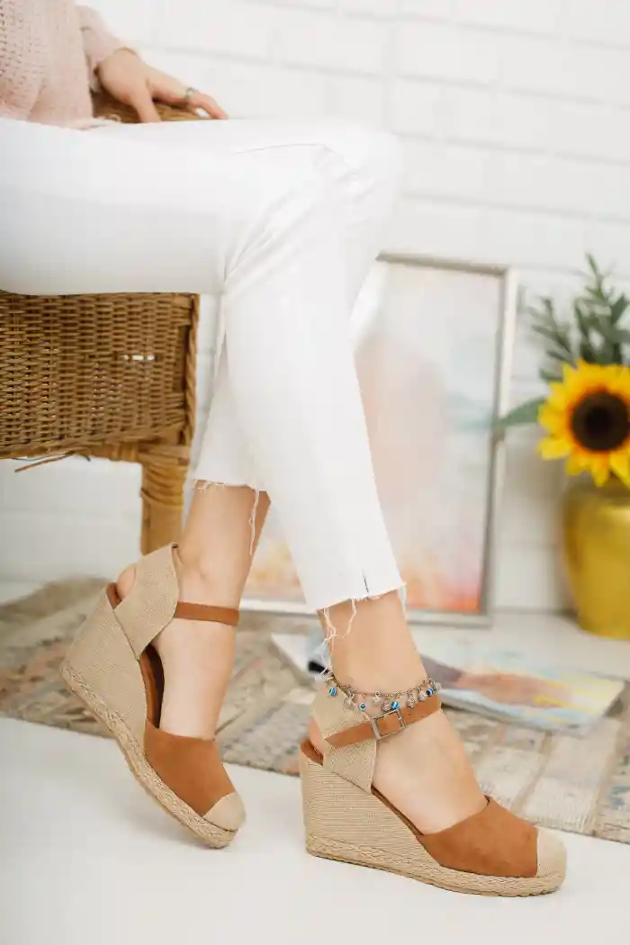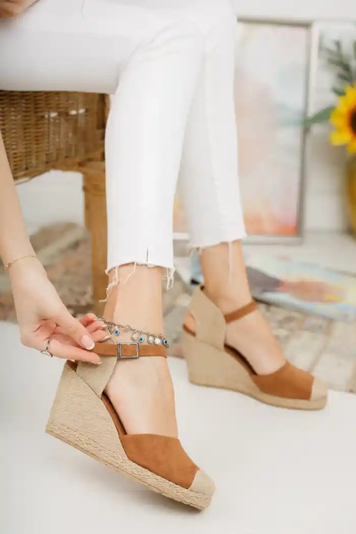 Feta tabanlı olan Vizon Taba Süet Kadın Dolgu Topuklu Ayakkabı, 13 cm dolgu topuk boyu ile ayakları uzun gösterir. Topuk boyunun yüksekliği nedeniyle bu ayakkabı özellikle özel davetler veya geceler için idealdir. Feta tabanı ise yürüyüşü destekleyerek ayak yorgunluğunu önler.